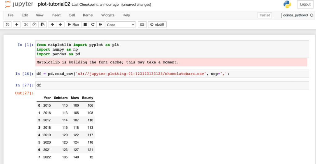 We will load our data using the Pandas library by directly importing data into a Pandas dataframe using the code below. In my example below, my S3 bucket is named ‘jupyter-plotting-01-123123123123’ and the data file name to import is chocolatebars.csv)