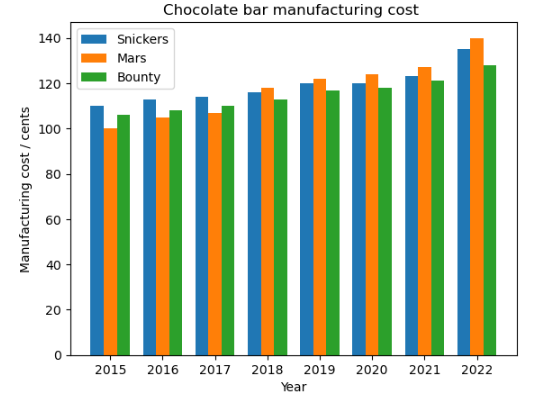 - Offset the bar graph for each series by subtracting/adding the bar width to the x axis data value ie ‘x_indexes – bar_offset‘ for snicker series