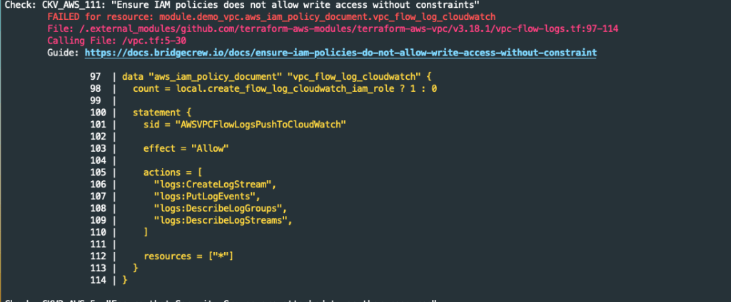 The first concern triggered flagged by Checkov is caused when enabling the option for VPC flow logging. The VPC modules creates an IAM role for logging that is not constrained to a Cloudwatch log group and stream.