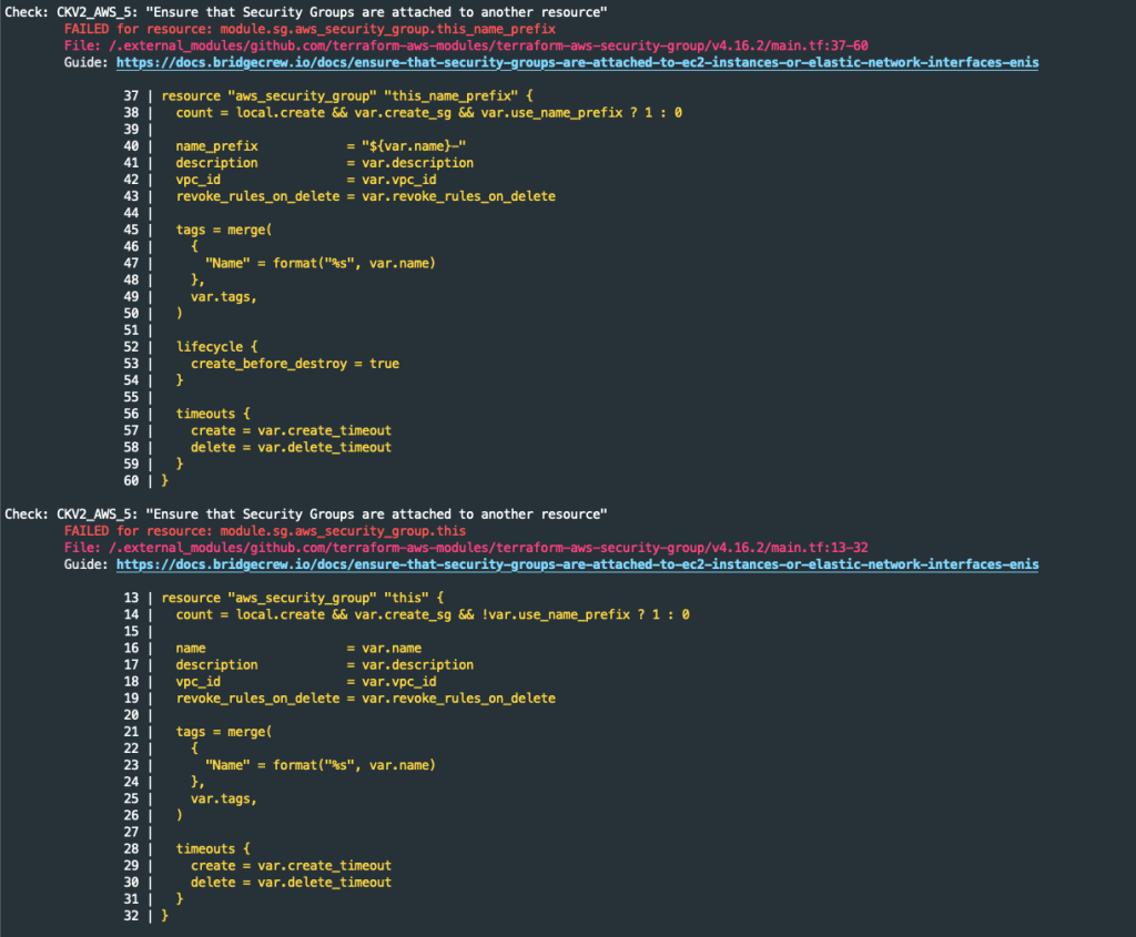 Checkov has found two security groups not attached to an EC2 instance or Elastic IP address. According to the Checkov website, this concert is low severity. Checkov is throwing a false positive alert here as the security group will be attached to the vpc interfaces. We will need to suppress the false alerts by adding ‘#checkov:skip=CKV2_AWS_5: “Ensure that Security Groups are attached to another resource”‘ to the module code.