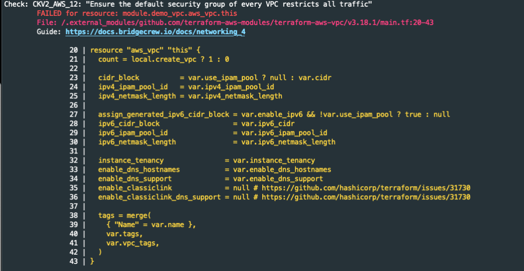 Even though Checkov was not 100% accurate in its findings, it did alert us to several security issues with the associated Terraform modules (i.e default VPC security group was unconstrained and the VPC flow logs role permissions allows logging to all log streams). I suspect Checkov would produce less false alerts if we had used native Terraform code without any Terraform modules. The information provided by Checkov allowed us to apply some mitigations to improve our security posture. Going forward, security linting tools such as Checkov will help us to improve our code security.
