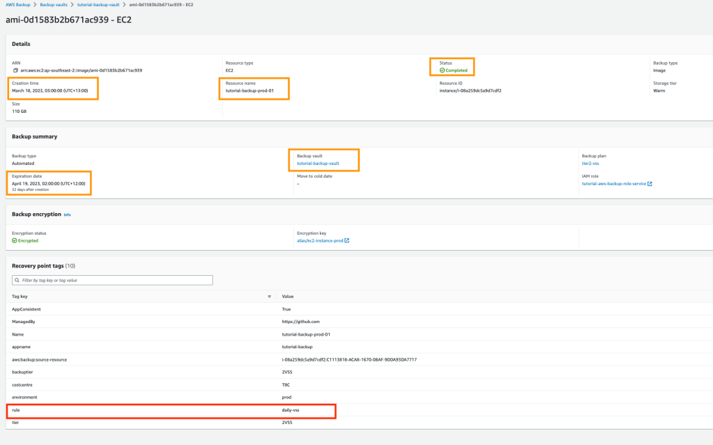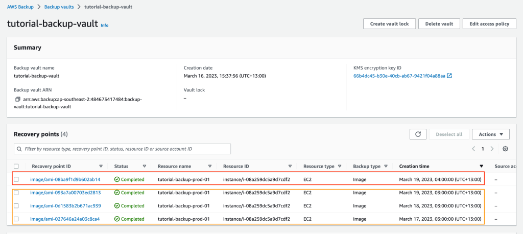 "backupVaultArn": "arn:aws:backup:ap-southeast-2:484673417484:backup-vault:tutorial-backup-vault",