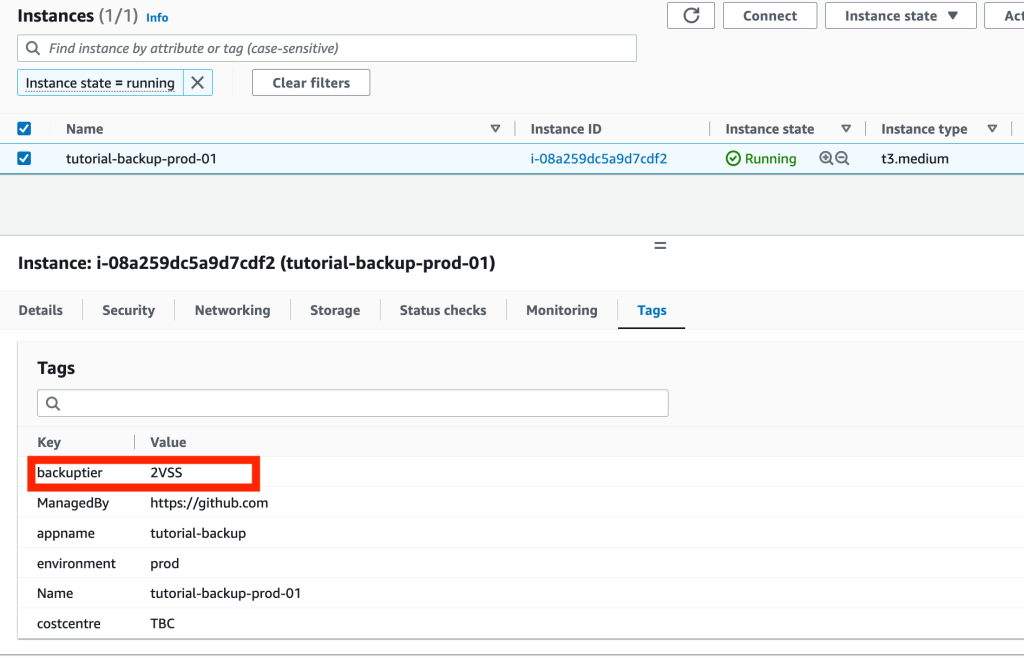 We want to make the enablement of backups as easy as possible for our admins. In this solution we can enable backups of our EC2 instance by adding a specific tag to the instance e.g. “backuptier : 2VSS” as shown below.