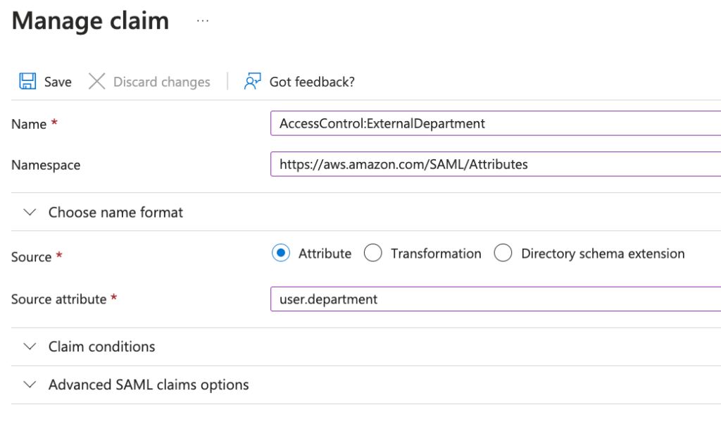 - Map the incoming SAML claim {user.department} to an AWS PrincipalTag called AzureDepartment