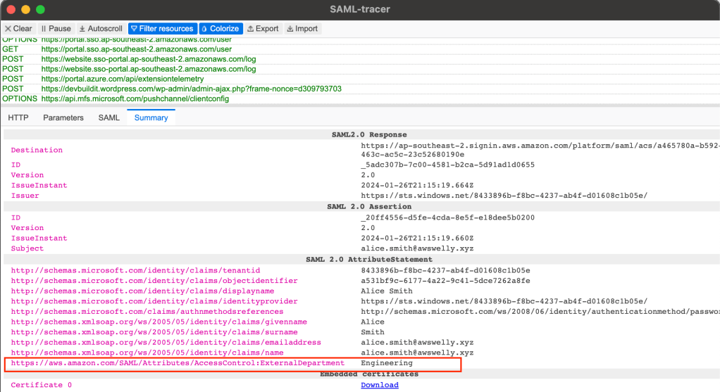 That completes the Azure set up. You can test that the new claim is being passed by using a Chrome extension ‘SAML-tracer’ as shown below.