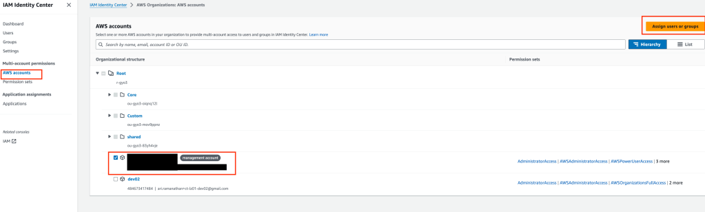 Open the AWS Identity Center service screen and click on Accounts. Expand Organization tree and select the account the EC2 instances were deployed into. Click on the “Assign user or groups” button.