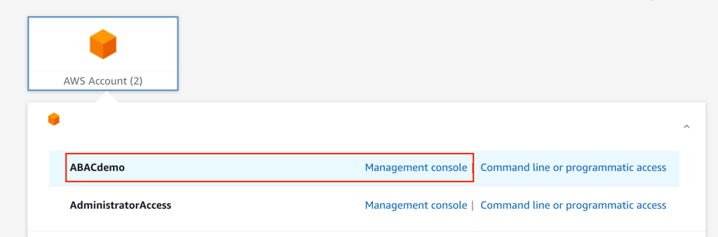 Once this is completed, log into your AWS Identity Center access portal as an Engineering Department user (Alice in my case) and select permission set ‘ABACdemo’ Management Console.