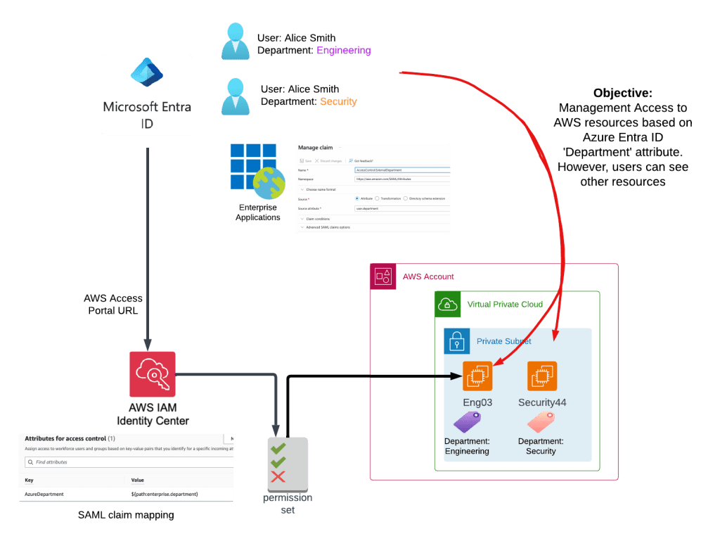 In our scenario, Alice works in the Engineering Department and Bob works in the Security Department. Each department has an AWS EC2 instance that they manage (Alice’s department owns EC2 instance ENG03, and Bob’s department owns EC2 instance Security44). Both users should be allowed to see each other’s EC2 instances but not be able to stop and start each other’s instances. EC2 instances owned by a department can only be stopped and started by users within that Department. The user’s department is defined in the Azure Entra ID user record. AWS identity Center login using Azure Entra ID credentials was set up in Part 1. The overview of what we will set up in Part 2 is shown below.