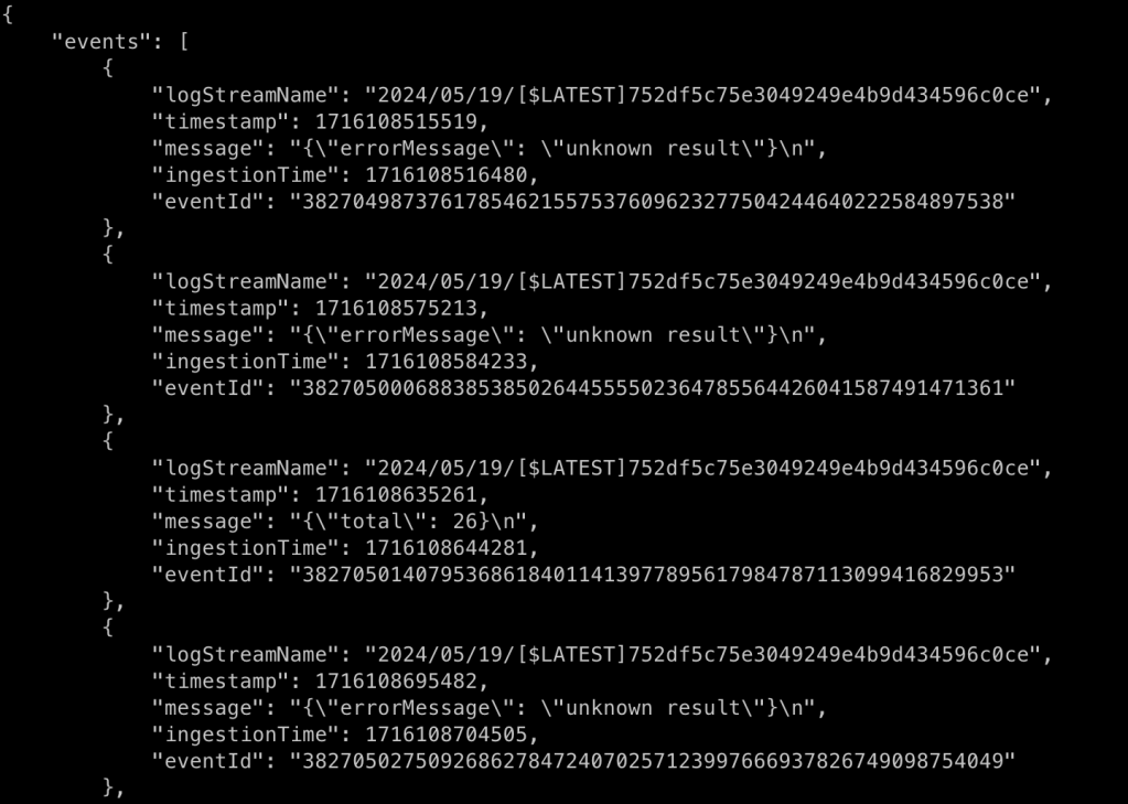 Otherwise, add a filter to the Cloudwatch console such as ‘{($.errorMessage = *) || ($.total = *)}’ to observe the outputs from the Lambda Function as shown below.