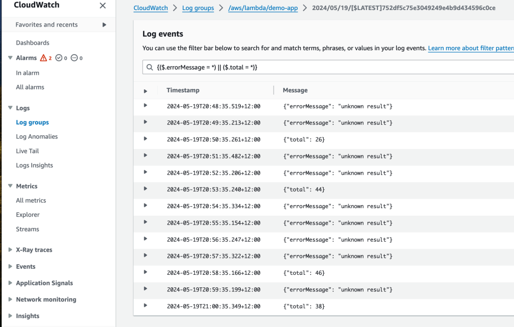 aws logs filter-log-events --log-group-name /aws/lambda/demo-app --filter-pattern "{($.errorMessage = \"*result*\") || ($.total = \"*\")}" --limit 20 --region ap-southeast-2