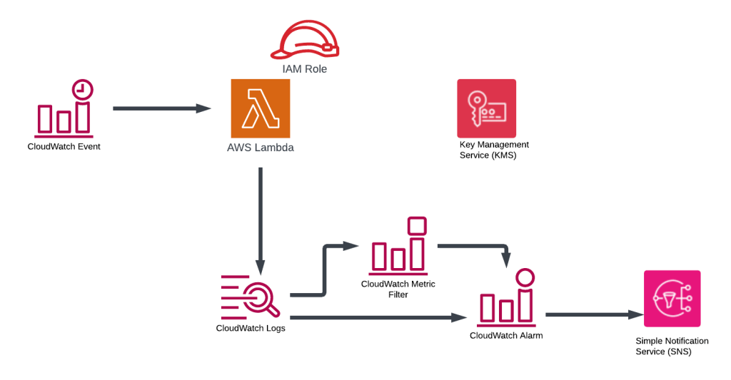 Cloudwatch Metrics & Alarms: provides functionality to monitor AWS resources via metrics calculations (eg sum, max, min etc within a period) and produces a datapoint. When a datapoint(s) exceeds a threshold, the alarm state is updated. The change of state can be assigned an action, in our case we send an alarm message to a SNS topic.