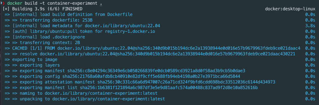 Running the following command ( docker build -t container-experiment .) in the folder with the Dockerfile will create a docker image based on ubuntu 22.04 and name (or tag) it container-experiment.